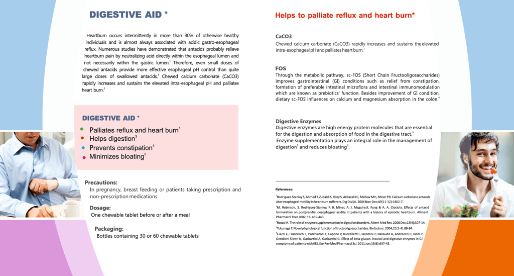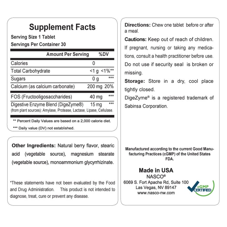 This chewable berry flavored tablet is easy to use before you eat meals that are heavy laden with protein, carbohydrates, and fats. Digestive Aid contains fructooligosaccharides (FOS), a prebiotic that serves as a substrate for microflora in the large intestine, increasing the overall gastrointestinal tract (GI Tract) health.